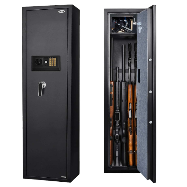 The safe is a larger and deeper safe that stores up to 5-6 rifles /shotguns up to 50 inches with/without scopes. It is deeper than other safes with only 11 inch and can't fit scoped rifles. It also has a separate lock box inside to store small guns and other valuables in your home or office.