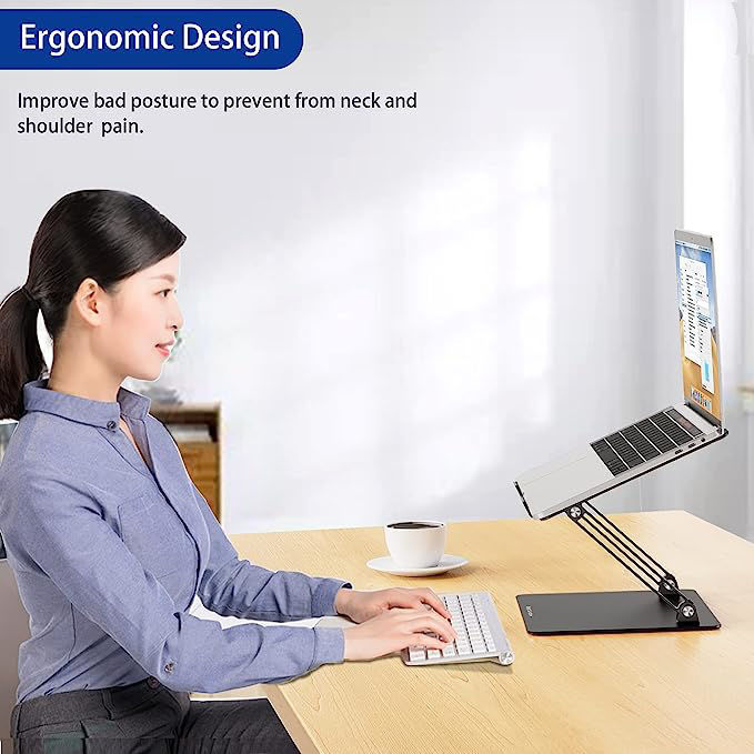 The laptop stand is made of sturdy aluminum, you can incline at different angles and stand it up higher or lower depending on your needs.