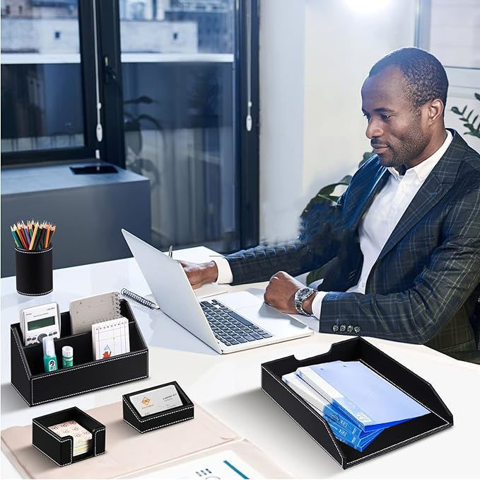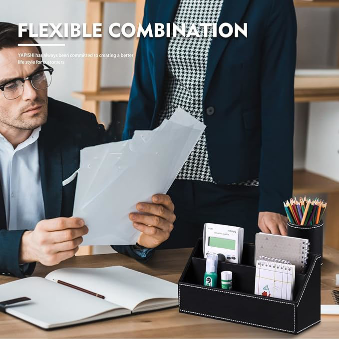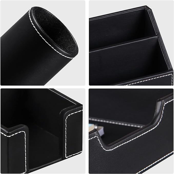 - Leather desktop organizer, 6 pieces set, can organize your office supplies: receipt slips, notebooks, folders, sticky notes, pens, pencils, accessories, remote controls, cell phones and cosmetics or other small sundries. Save time to find things on your desk. Clean and tidy working environment can improve your work efficiency.