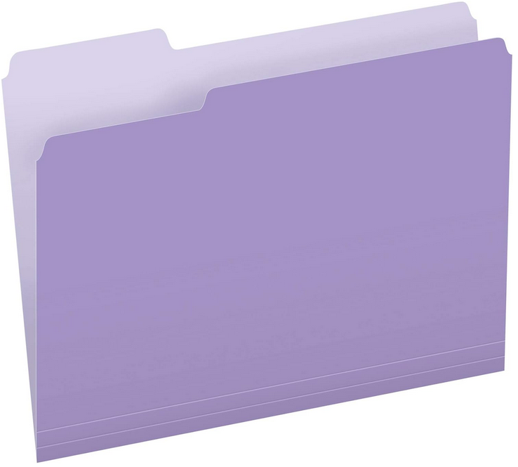 Pendaflex Two-Tone Color File Folders come in brilliant shades with lighter interiors to prevent time-wasting misfiles. Create bright, color-coded files for fast, efficient filing. 1/3-Cut tabs. Letter size, lavander.