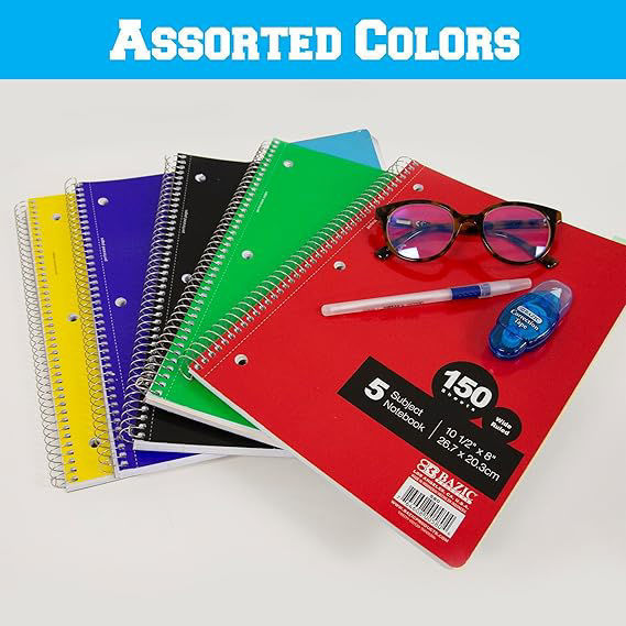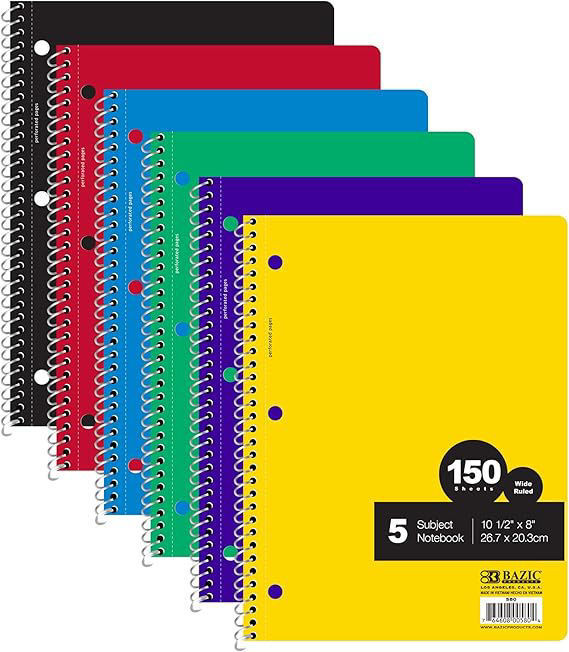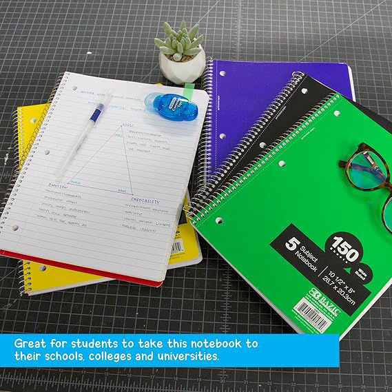 5-subject spiral notebooks come with 150 sheets of college-ruled paper.