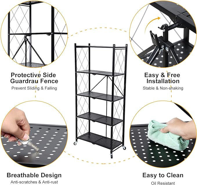 The foldable storage shelves features 4 professional grade caster wheels for easy mobility .