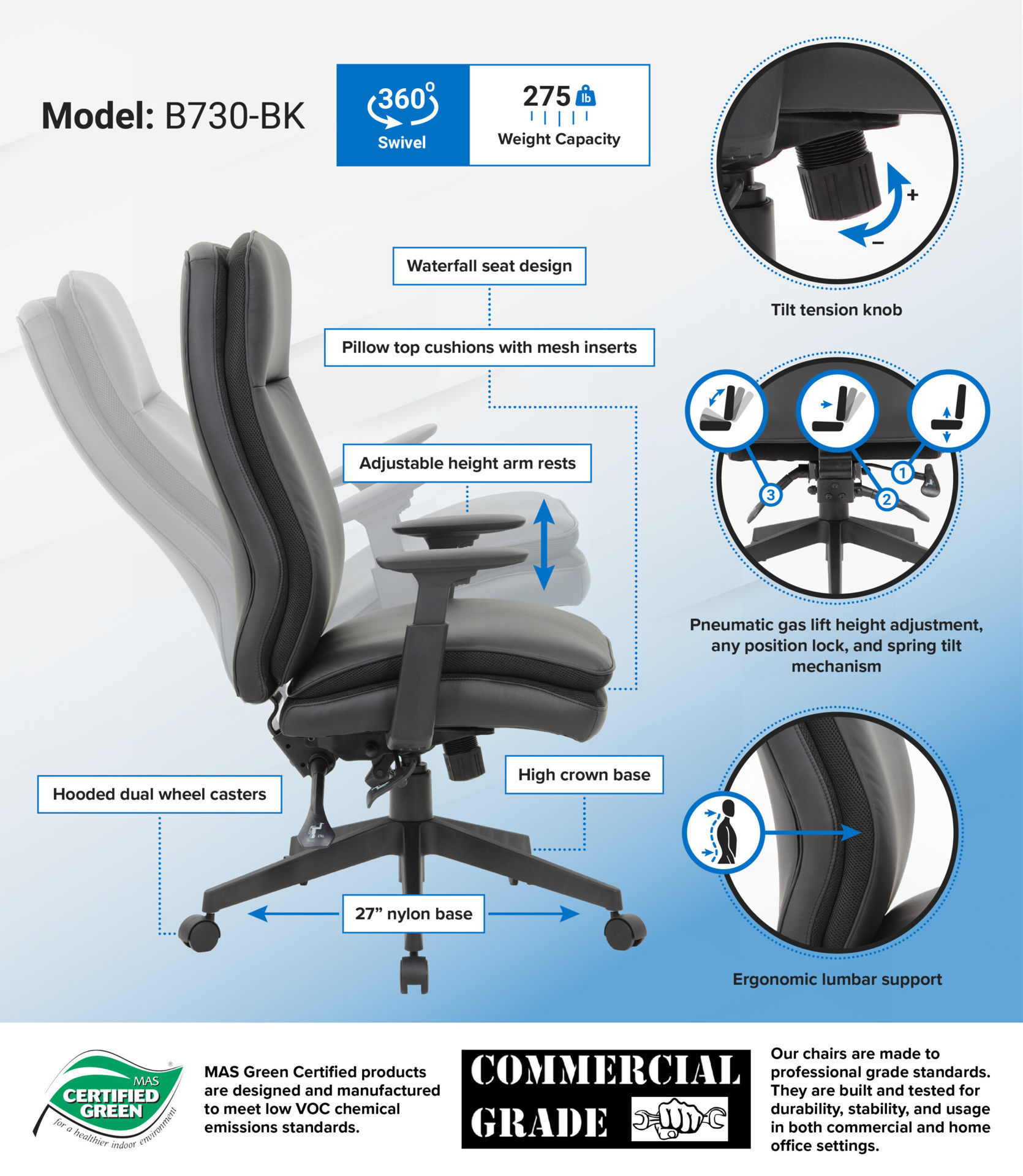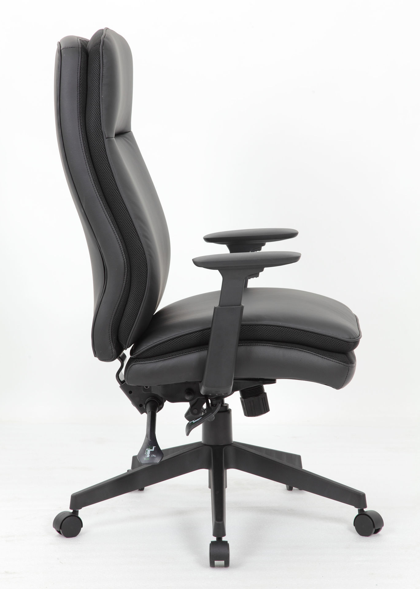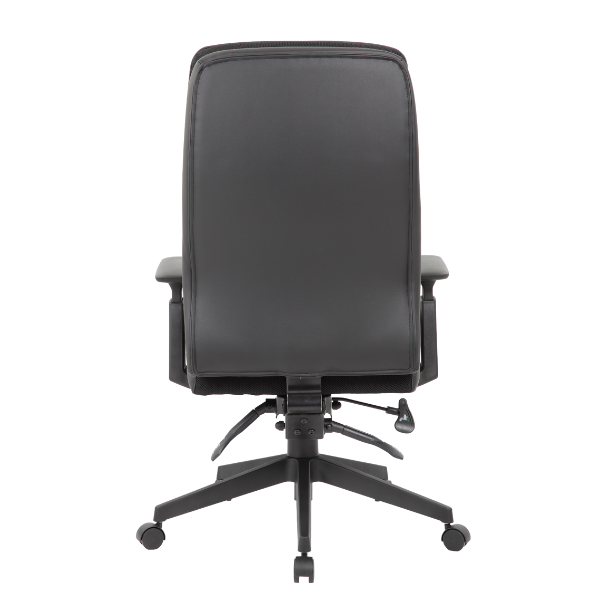 This Caressoft high back executive chair brings comfort and stability to any office environment. It features beautiful and durable Caressoft upholstery and high-back styling with exemplary lumbar support. Adjustable height arms. In addition, the chair has pneumatic gas lift seat height adjustment, an adjustable tilt tension control, a spring tilt mechanism, and locks in the upright position. Its large 27” 5 star nylon base provides stability while affording plenty of mobility thanks to its five hooded double wheel casters.