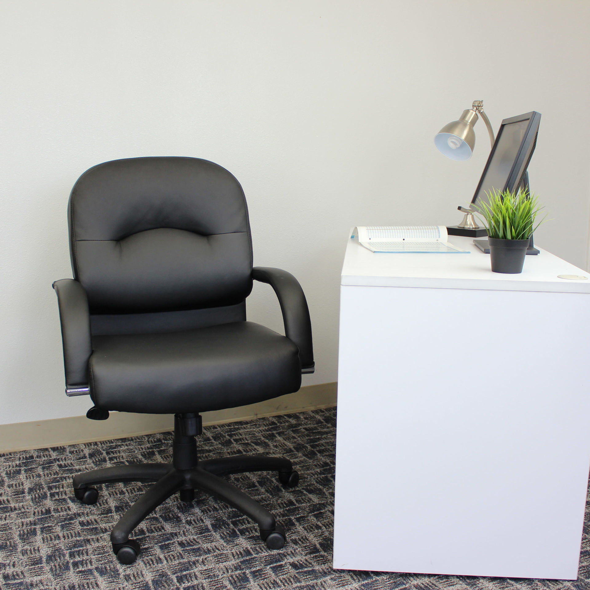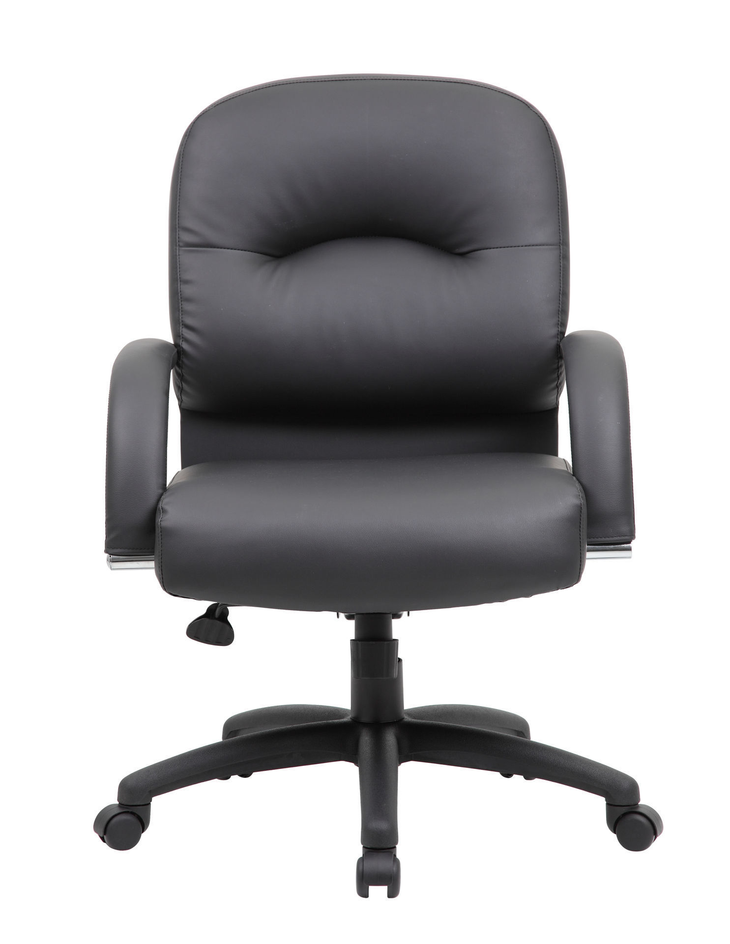 This Caressoft mid back executive chair brings comfort and stability to any office environment. It features beautiful and durable Caressoft upholstery and mid-back styling with exemplary lumbar support. Additionally, the chair has pneumatic gas lift seat height adjustment, adjustable tilt tension control, spring tilt mechanism, and an upright locking position. Its large 27-inch nylon base provides stability while affording plenty of mobility thanks to its five hooded double wheel casters. Those looking for a set will be please to know that it pairs perfectly with our B7401 high back and B7409 guest chair models.