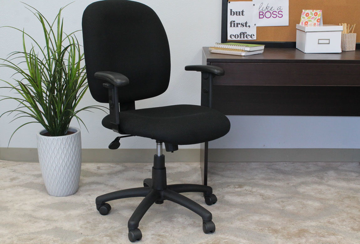 This Black Ergonomic Task Chair has contoured cushions with lumbar support. It is elegantly upholstered with Chenille fabric. The height adjustable arms provide comfortable and versatile arm rests that can suit your personal preferences. It has an upright locking position feature, providing comfortable back support. The pneumatic adjustable gas lift allows for easy seat height adjustment, to help you find the personalized sitting style that suits you and your work environment. The large 25-inch black nylon base provides added stability to the chair. The hooded double wheel casters make it easy to move and shift directions.