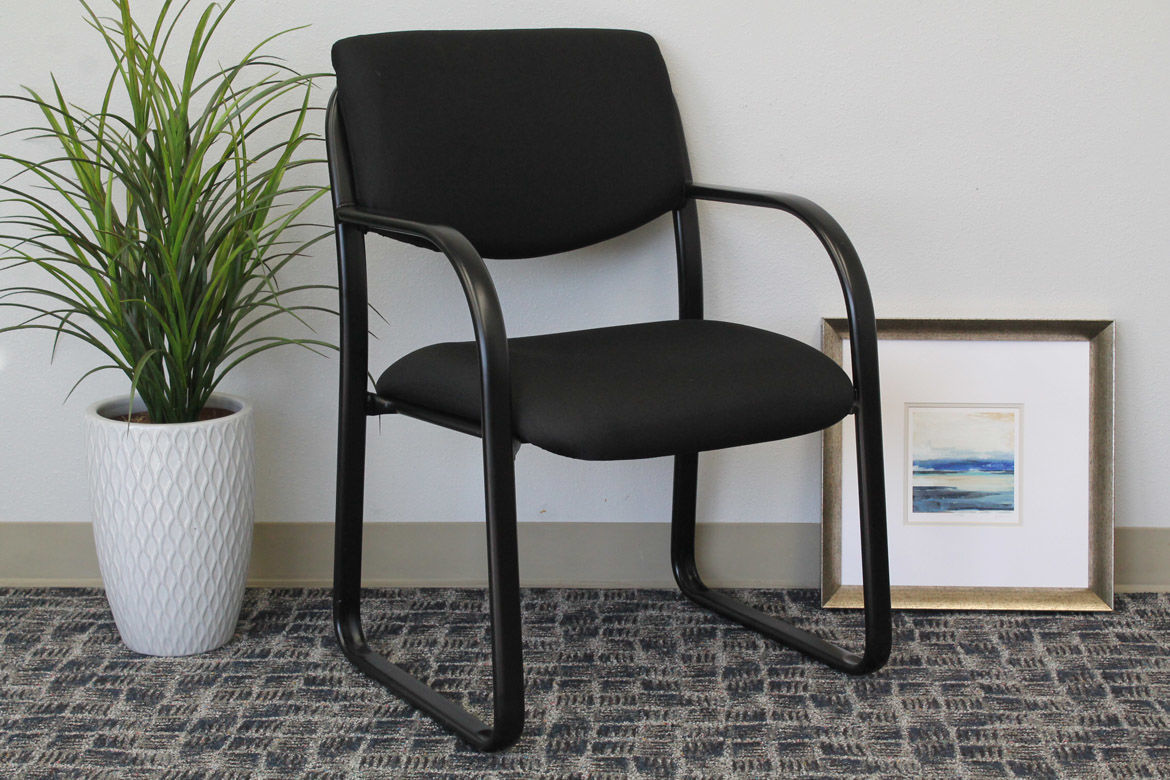 This eye-catching guest chair in black is made from high quality, contract fabric and features a strong black sled base that is not only sturdy and reliable, but attractive and stylish as well. The guest chairs style, design and especially extreme comfortability make it a really great addition to most any room or office. The chair itself sits at a fixed height with fixed arm, boasts a weight capacity of up to 275 lbs. and adds a pop of class to any room.