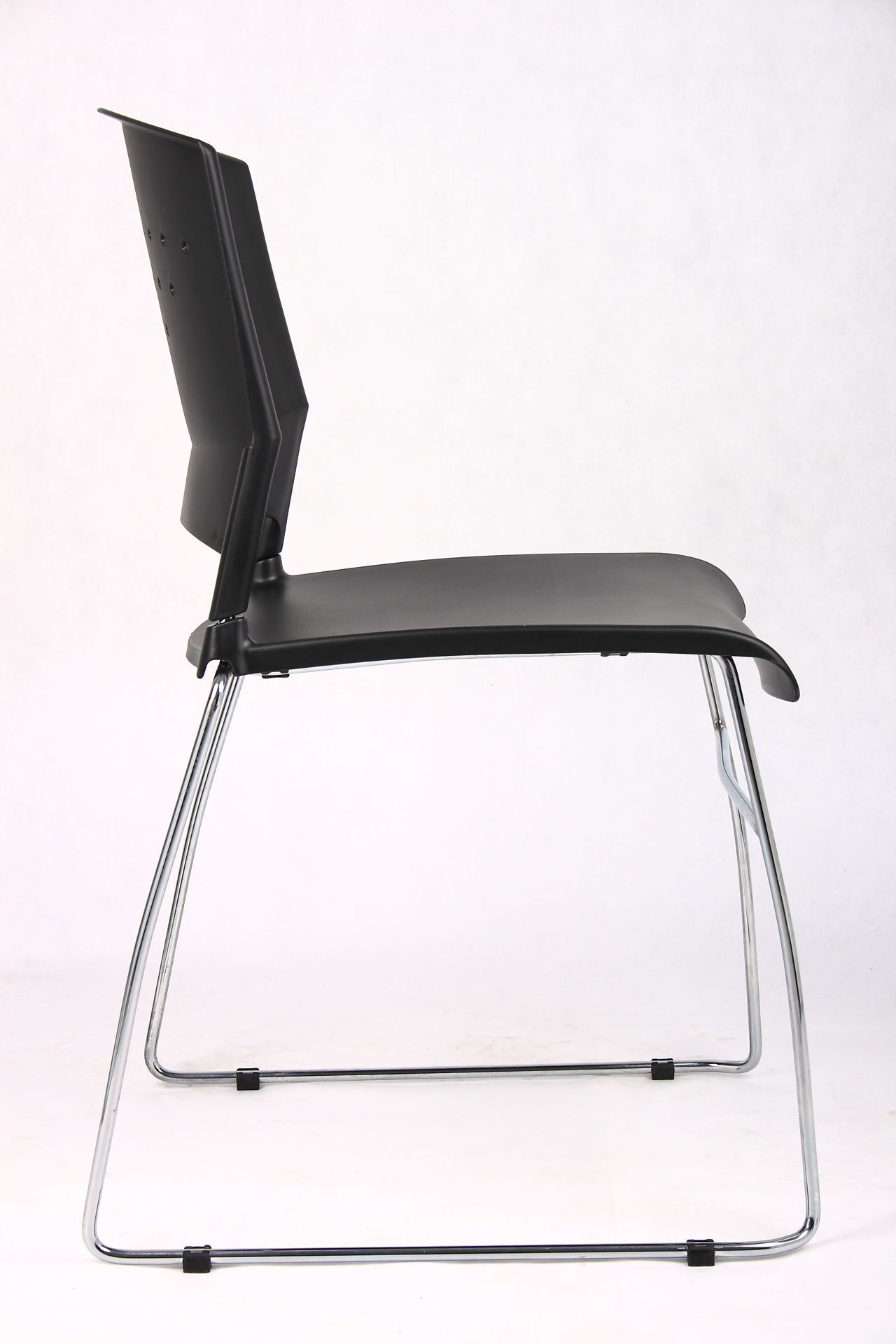 If you are looking for economical stacked chairs with a stylish outlook, the Boss black stack chair is exactly what you need. The seat and back are made of black polypropylene, which gives the chair its superior durability and lumbar support. The chair has a solid chrome frame and the sculpted seat back has an opening integrated into it for enhanced ease with mobility and stacking. These chairs can be stacked up to 16 high on a dolly (B1-400 sold separately), or 5 high on the floor which will save storage space as well. Ganging clamps are also available (B1-400GC sold separately) so that multiple units can be attached at the bottom of the leg.