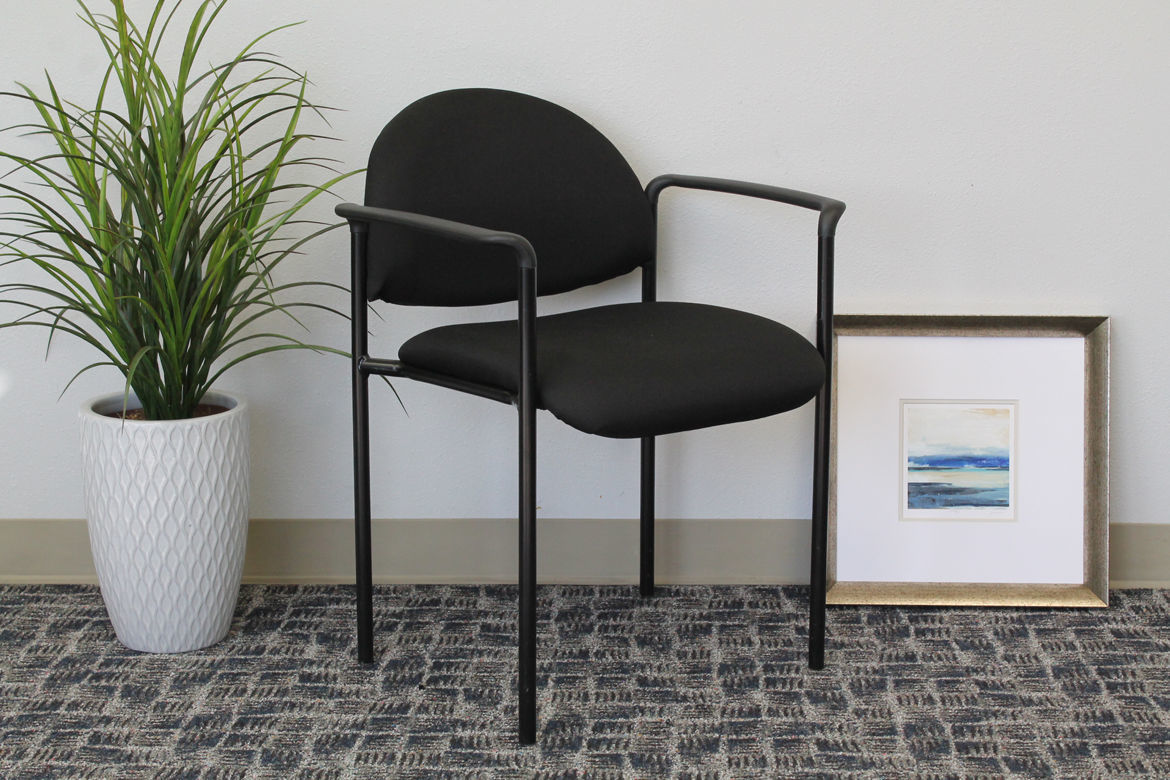This stacking chair in black offers the perfect seating solution for any space. The chair is made with a gorgeous crepe material and can be stacked 4 high for ultimate storage capacity. It is designed with black fixed arms for extra comfort and the cushions add a pop of color to any room or office. The chair includes a sturdy four leg tubular frame in black steel and offers a weight capacity of 275 lbs.