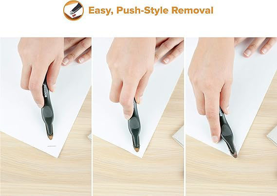 Push style mechanism smoothly lifts staples without tearing paper