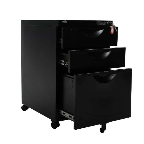 Stability and security are essential features of this metal 3 drawer pedestal. The anti-tipping wheel located at the bottom of the large drawer enhances the cabinet's stability, even when the drawer is fully open. You can trust that your files will remain secure and the 3 drawers filing cabinet will maintain its balance.