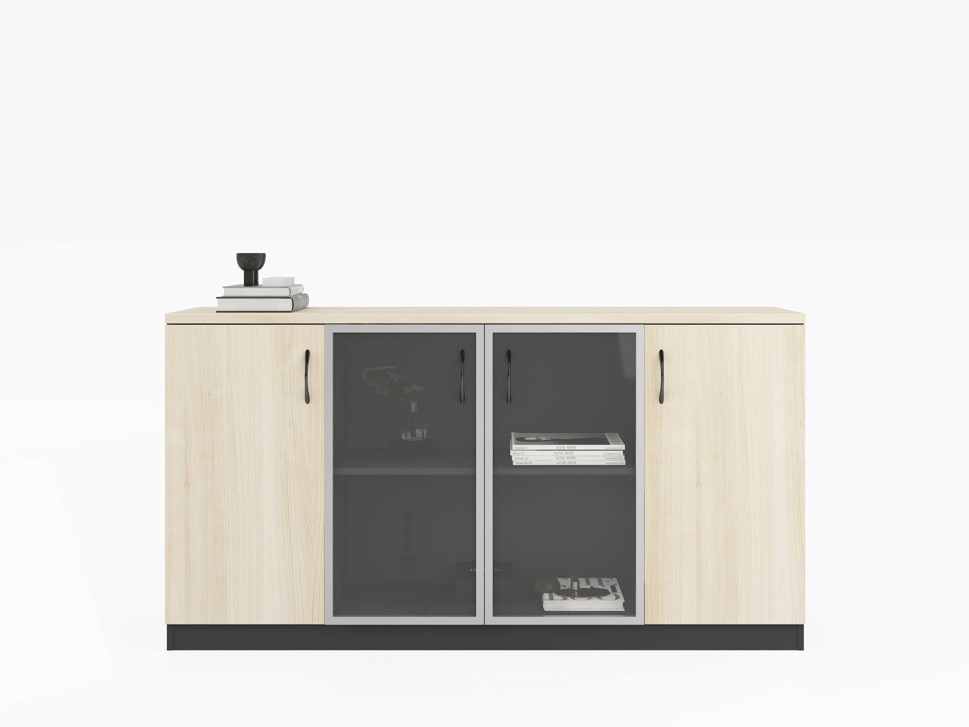 Soft closing, lockable cabinet doors on each side of the unit conceal equipment and supplies you want kept out of sight; middle aluminium frame glass doors are perfect for displaying books and keep sakes