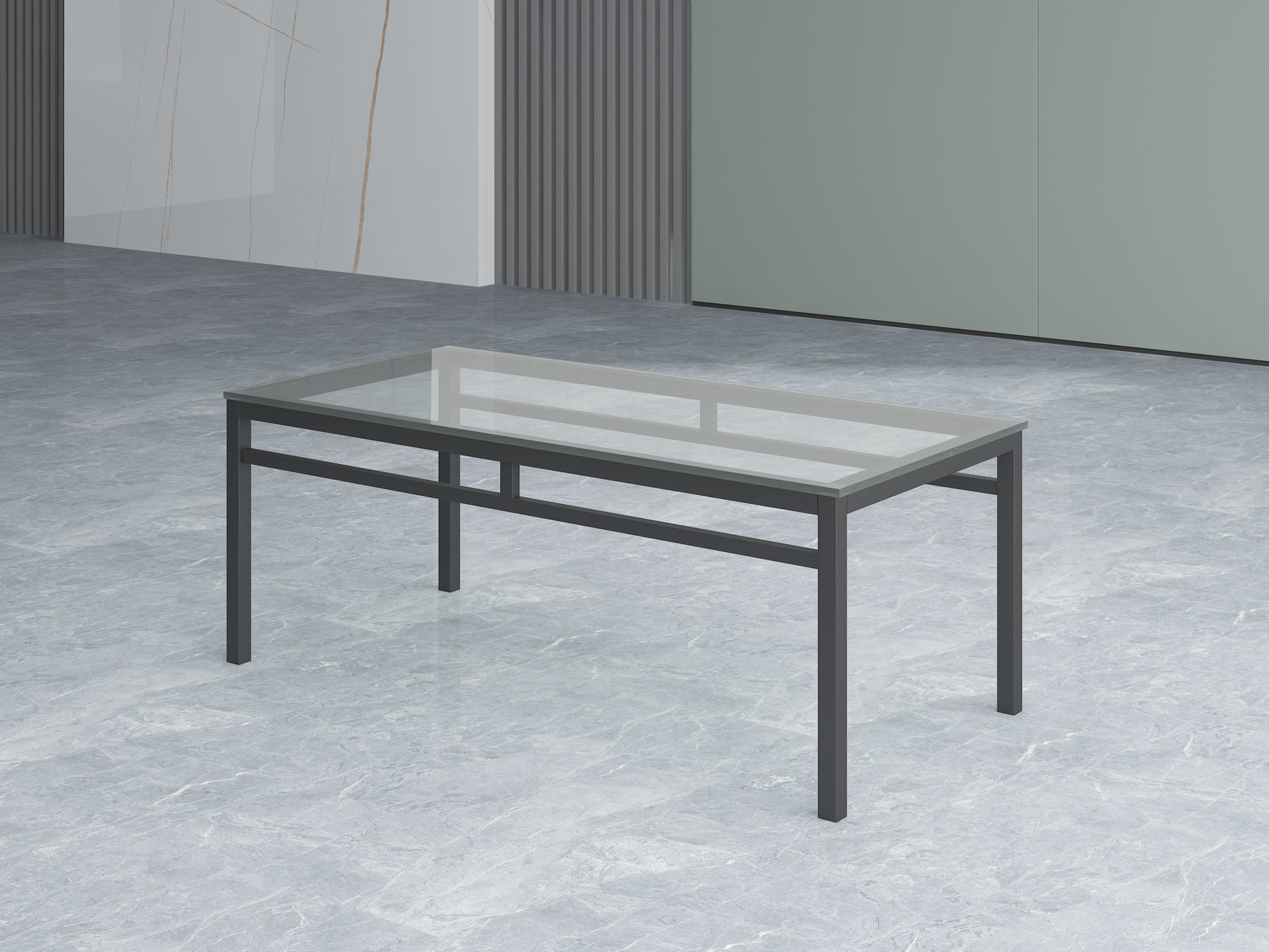 Coffee table is made of coated black metal frame with solid 8 mm tempered glass table top.