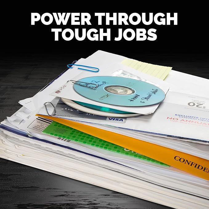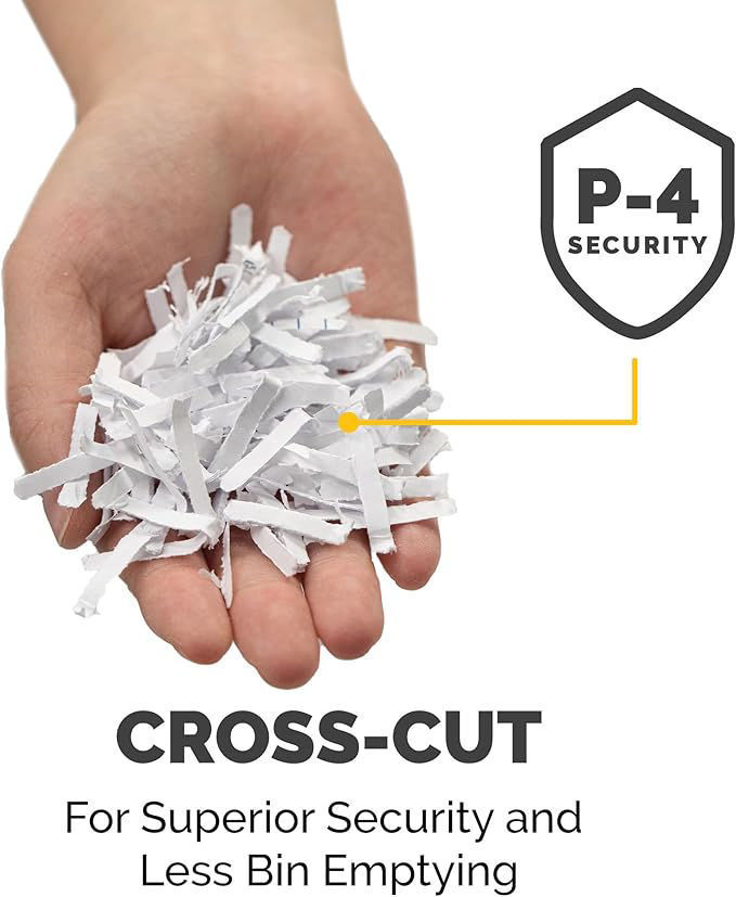 Shreds up to 18 sheets of paper per pass into 397 (5/32” x 1-1/2” Security Level P-4) cross-cut particles; shreds staples, credit cards, paper clips, CDs/DVDs, junk mail