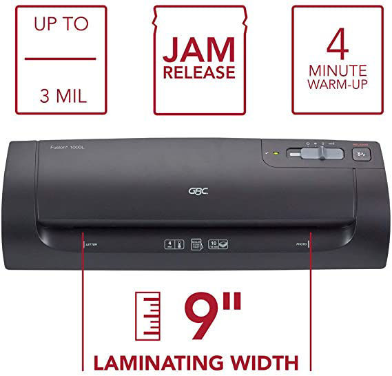 The 9" laminating width allows for a variety of projects, while smooth rollers help projects stay wrinkle-free. Compatible with any 3 and 5 mil laminating pouches.