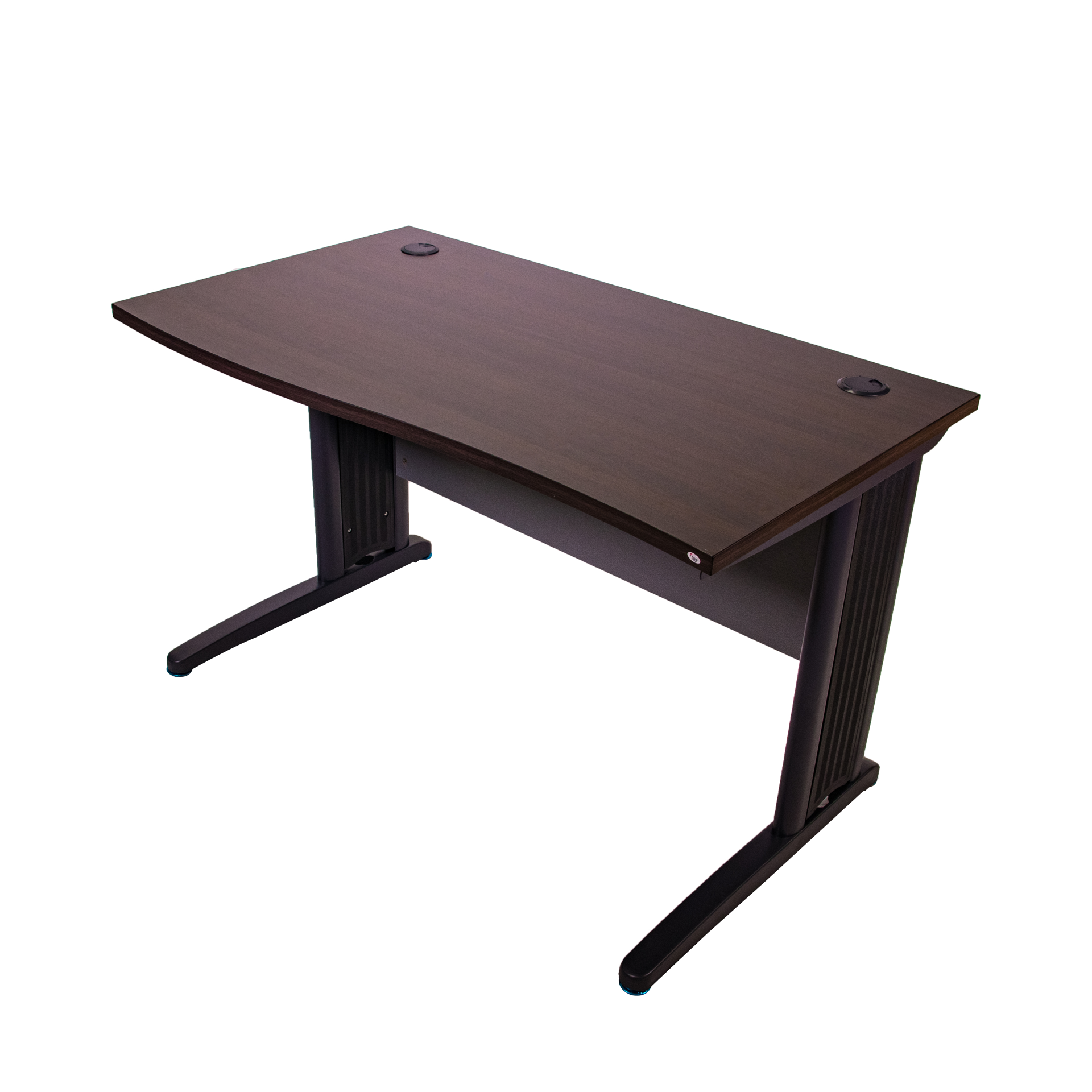 Large durable work surface with two grommets, metal legs and a modesty panel in front.