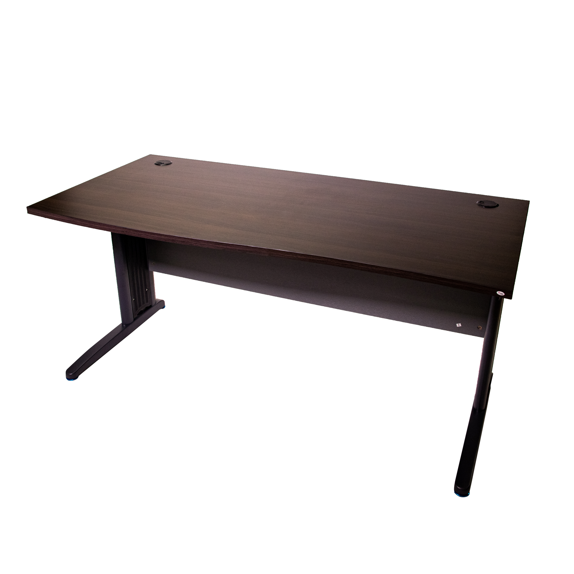 Large durable work surface with two grommets, metal legs and a modesty panel in front.