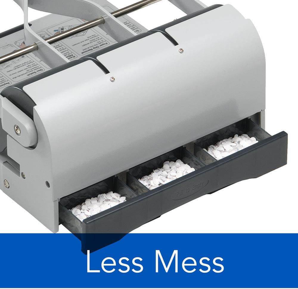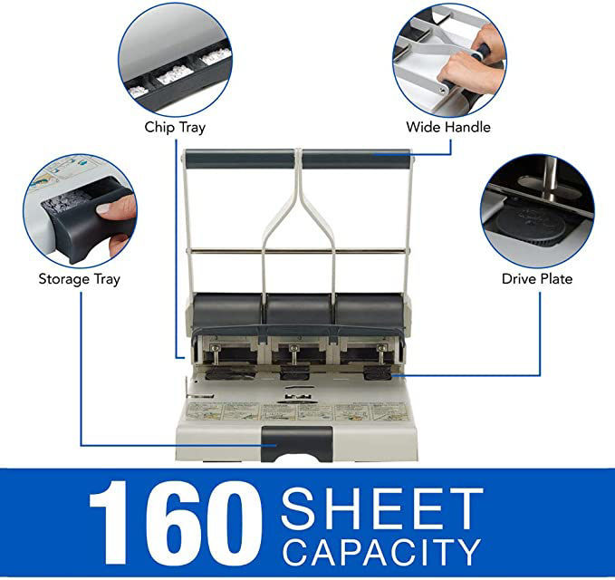 High capacity punch powers through stacks of paper, piercing up to 160 sheets, with the option of either 9/32" or 11/32" holes.