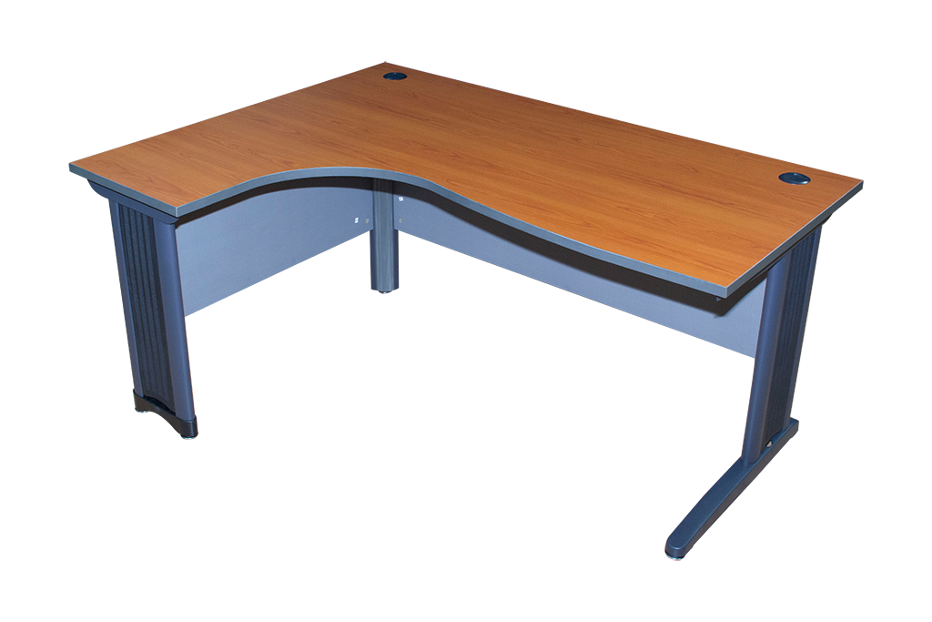 Large durable work surface with two grommets, metal legs and a modesty panel in front.